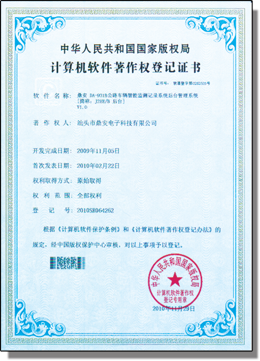 DA-931后平臺數(shù)據(jù)管理系統(tǒng)嚴格按照GA/T 497-2009《公路車輛智能監(jiān)測記錄系統(tǒng)通用技術(shù)條件》、《廣東省治安卡口視頻監(jiān)控系統(tǒng)建設規(guī)范》、GA/T 496–2009《闖紅燈自動記錄系統(tǒng)通用技術(shù)條件》等相關(guān)公共安全行業(yè)標準,對整個系統(tǒng)建設進行了詳細規(guī)劃設計,充分體現(xiàn)出安全、實用、合理、易維護等特點。該系統(tǒng)已得到國家版權(quán)局計算機軟件著作登記權(quán)證書(軟著登字第0252535號)。