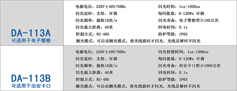 鼎光 DA-113系列數(shù)字閃光燈通過(guò)RS-485接口實(shí)現(xiàn)閃光燈的數(shù)字化控制,設(shè)定實(shí)際所需要的閃光參數(shù):閃光時(shí) 間1us-1000us內(nèi)任意可調(diào);支持閃光觸發(fā)延時(shí),延時(shí)的時(shí)間可調(diào);可啟動(dòng)測(cè)光模式,在光線(xiàn)弱時(shí)自動(dòng)啟動(dòng)閃光功 能或自動(dòng)調(diào)節(jié)曝光參數(shù),保證不同光照下最佳的拍照效果;支持現(xiàn)場(chǎng)和遠(yuǎn)程設(shè)置參數(shù),閃光燈的特點(diǎn)是功能齊全, 可適用于各種智能交通抓拍系統(tǒng)的需要。是目前市場(chǎng)上電子警察、治安卡口升級(jí)改造的首選閃光燈。鼎光 DA-113 系列數(shù)字閃光燈分為兩個(gè)版本,具體參數(shù)如下: